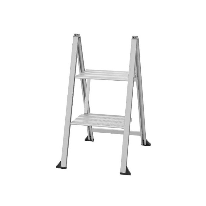 En liten smart och lättanvänd arbetspall i aluminium. Passar bra överallt där du ibland behöver arbeta eller nå en liten bit högre upp. Stegen är lätt att bära, transportera och förvara, samt enkel att fälla upp och ihop. Ihopfälld är den endast 35 mm tjock. De extra djupa stegen, 210 mm, gör det både bekvämt och säkert att klättra. Anodiserat aluminium för att inte svärta ner dina händer eller kläder. En perfekt hjälpreda i exempelvis hemmet, butiken eller på lagret. Höjd: 700 mm Höjd plattform: 480 mm Bredd: 415 mm Vikt: 3,8 kg Antal steg: 2 Djup på steg: 210 mm