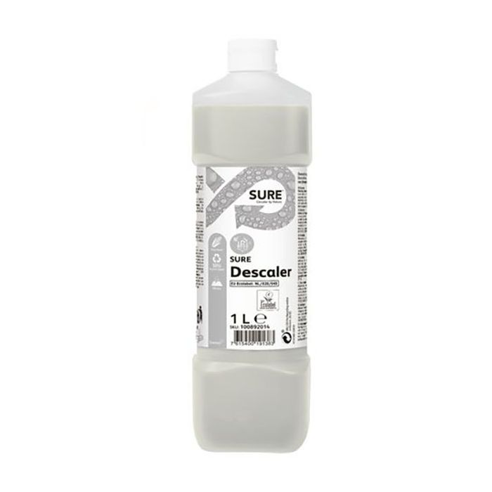 SURE Descaler från Diversey är ett miljömedvetet och väldigt effektivt val. Lösningen är växtbaserad, 100 % nedbrytbar och använder förnybara energikällor. Den här koncentrerade avkalkningsvätskan är så effektiv att den enkelt avlägsnar kalkbeläggningar och -avlagringar och tvålrester. Rengöringsmedlet bryter snabbt ned och avlägsnar kalkbeläggningar och förhindrar att de återkommer. Den passar bra att använda på en mängd olika köksredskap, utrustning och även diskmaskiner.