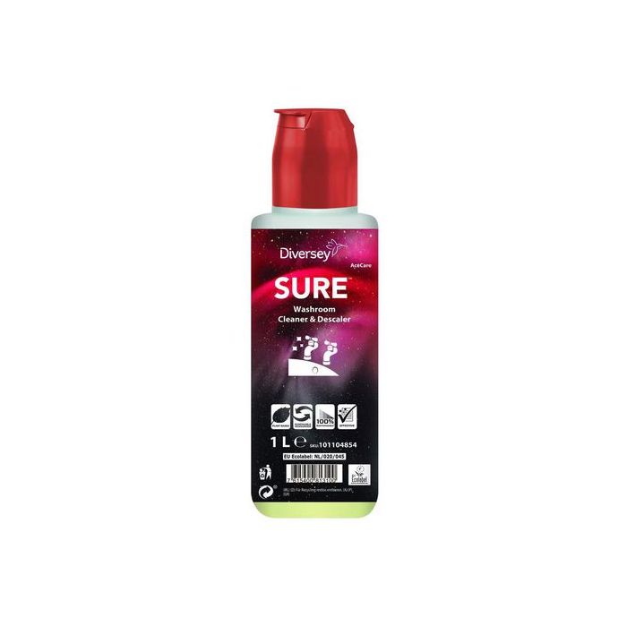 Surt rengörings- och avkalkningsmedel för sanitetsutrymmen. SURE Washroom Cleaner & Descaler är ett koncentrerat rengöringsmedel för daglig eller periodisk rengöring av alla vattentåliga hårda ytor i sanitetsutrymmen. Formuleringen rengör effektivt och förhindra uppbyggnad av kalkavlagringar. Anpassad för användning på kromade och rostfria ytor, utan färg och parfym. SURE