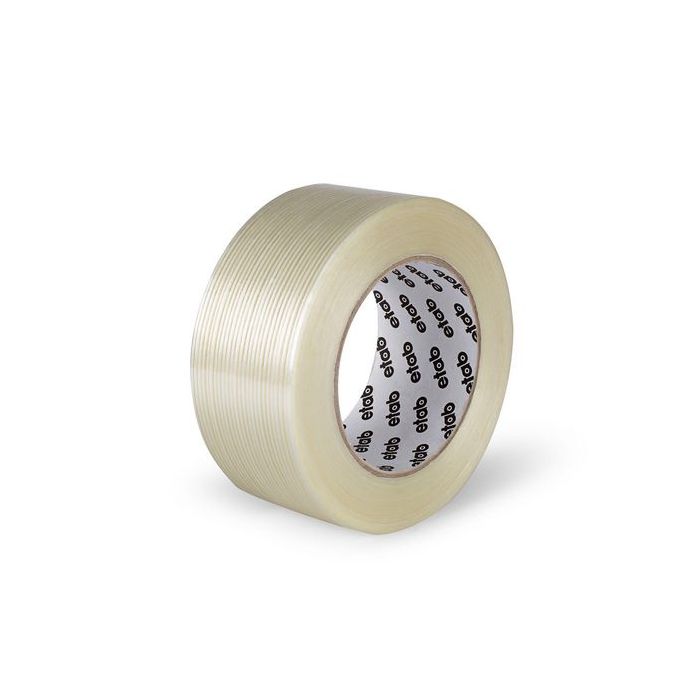 PP-film armerad med längsgående glasfibertrådar. Syntetiskt häftämne.Hårdhäftande, hög draghållfasthet. Ca 5 trådar per cm bredd. För bandning, buntning, pallsäkring samt förslutning av tyngre emballage.