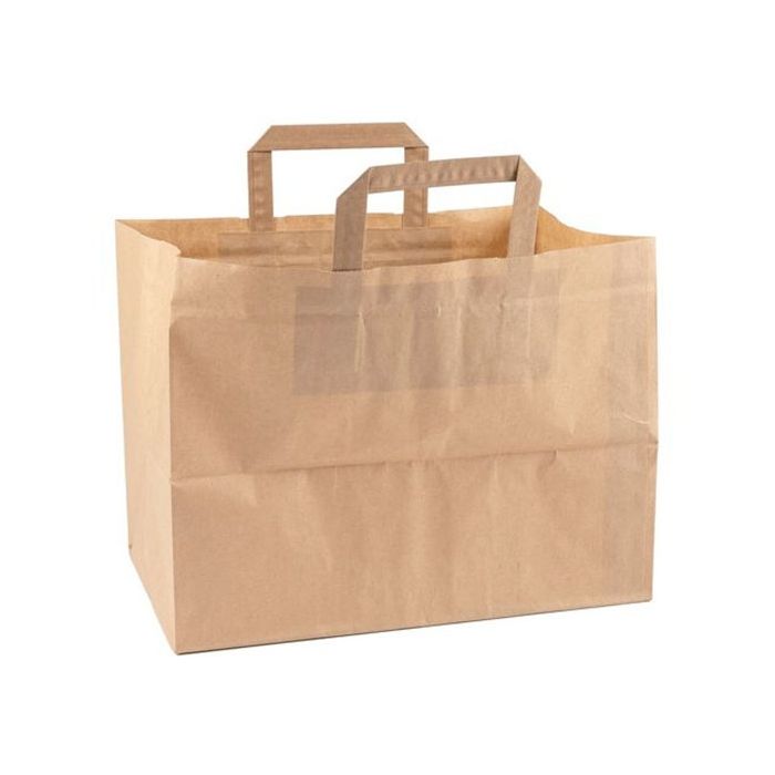 Bärkasse för Take Away i brunt kraftpapper med förstärkt botten och platta handtag.