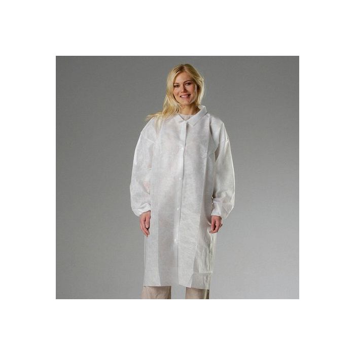 Besöksrock knälångBekväm knälång modell med tryckknappar som ger stor rörelseförmåga. Elastiska manschetter. Tillverkad av nonwoven (fiberduk) i polypropylen. Godkänd för användning i kontakt med mat och livsmedel.