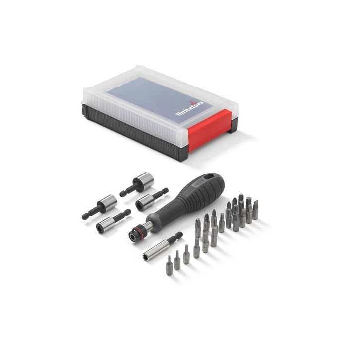 Set med korta bits och handtag i en praktisk plastlåda. Utvecklat för professionellt bruk tillsammans med hantverkare. Innehåller sp årbits 3.5, 4.0, 5.5, 6.5, PH 1, 2 och 3, PZ 1, 2 and 3, insex 2, 2.5, 3, 4, 5 och 6,5 mm, Torx® T10, 15, 20, 25, 30, 40 och 45, mag netisk hylsbits 6, 8, 10 och 13 mm samt en 60 mm bitshållare.