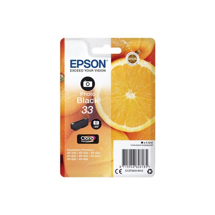 Fotosvart Epson 33 Claria Premium-bläck ger skarpa, tydliga dokument och blanka fotoutskrifter. Epson Orange 33 Claria Premium-bläckpatron med fotosvart färg är prisvärd, enkel att använda och tillverkad med kvalitet och prestanda i åtanke. Bläcket i Epson Claria Premium-serien har utformats för att framställa högkvalitativa, kladdfria dokument och utskrifter av fotokvalitet med klara färger. Det här bläcket fungerar bäst i kombination med Epson-skrivare och ger enastående utskrifter som håller längre. En svart bläckpatron skriver ut upp till 200 fotoutskrifter.