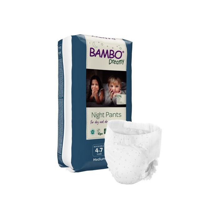 För torra & lugna nätter. Bambo Nature åtar sig inte bara att erbjuda en bekväm, absorberande blöja till ditt barn, utan även att vä rna miljön under tillverkningsprocessen. Våra nattbyxor produceras med förnybar energi (som täcks av förnybara energicertifikat) i v år danska produktionsanläggning. Dessutom är de fria från skadliga konserveringsmedel, parfymer och parabener. Dreamy Night Pants är utformade för att ge dig och ditt barn en bättre nattsömn, oavsett om ditt barn sover hemma eller hos vänner. Med Dreamy Night Pant s kan du vara säker på att sängvätning inte står i vägen för en skön nattsömn. Våra miljöåtaganden sträcker sig även till vår förpac kning, som består av 30 % återvunnen plast. De återvunna materialen kommer från hushålls plastavfall, som rengörs noggrant och sorte ras efter kvalitet. Förpackningarna ska återvinnas med annat plastavfall.