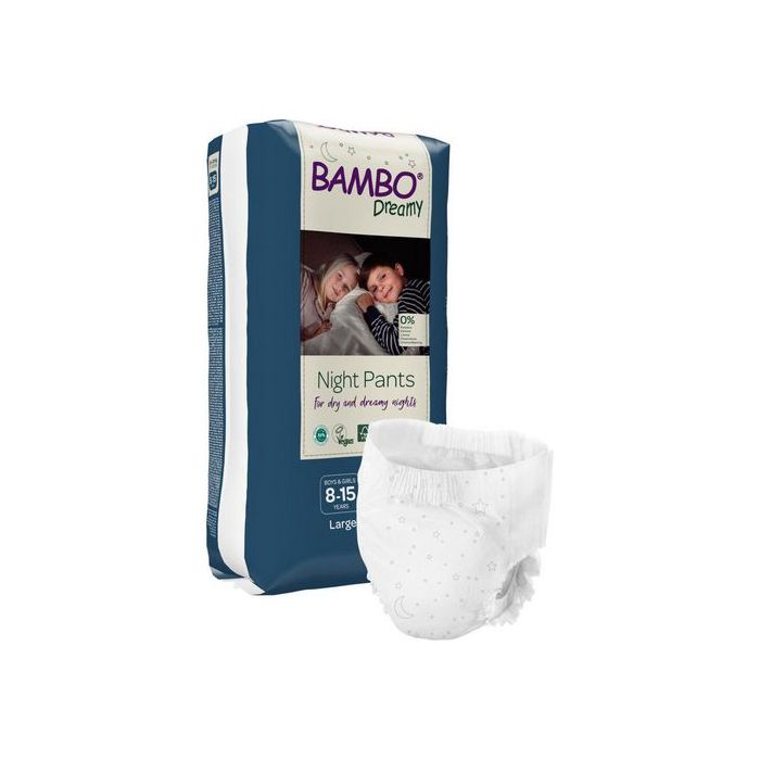 För torra & lugna nätter. Bambo Nature åtar sig inte bara att erbjuda en bekväm, absorberande blöja till ditt barn, utan även att vä rna miljön under tillverkningsprocessen. Våra nattbyxor produceras med förnybar energi (som täcks av förnybara energicertifikat) i v år danska produktionsanläggning. Dessutom är de fria från skadliga konserveringsmedel, parfymer och parabener. Dreamy Night Pants är utformade för att ge dig och ditt barn en bättre nattsömn, oavsett om ditt barn sover hemma eller hos vänner. Med Dreamy Night Pant s kan du vara säker på att sängvätning inte står i vägen för en skön nattsömn. Våra miljöåtaganden sträcker sig även till vår förpac kning, som består av 30 % återvunnen plast. De återvunna materialen kommer från hushålls plastavfall, som rengörs noggrant och sorte ras efter kvalitet. Förpackningarna ska återvinnas med annat plastavfall.