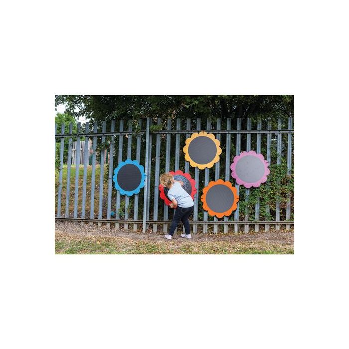 5st blomformade färgglada griffeltavlor. Fäst dem mot vägg, stängsel eller staket och gör lekplatsen till ett roligt och spännande område att utforska.Förstansade hål för upphängning. (fästen ingår ej)Mått: 50cm diameter