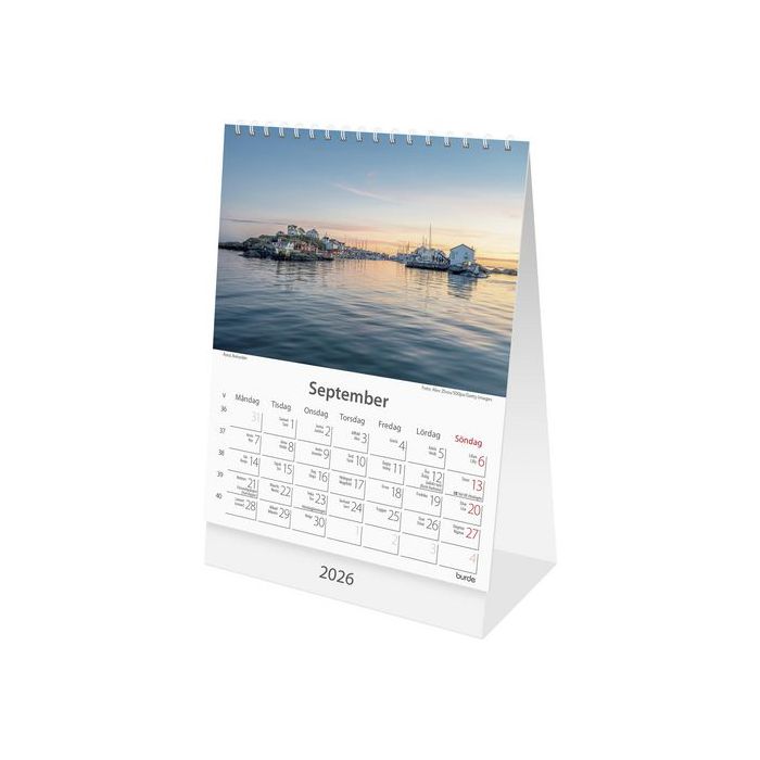 Kalender i stående form att ställa på bordet, tar inte mycket plats och ger bra översikt! Bordskalendern har tolv fina bilder frånsvensk natur.Kalender 2026 från Burde. Format: A5. Layout: Månad/blad. Kalendarium: 2026-01-01