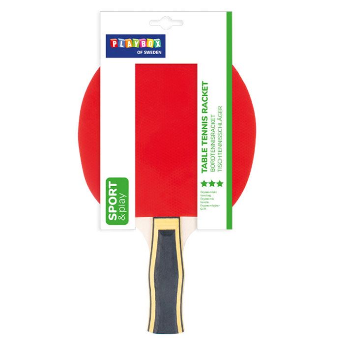 Bordtennisracket med blått handtag och gummi i en blandning av rött och svart.