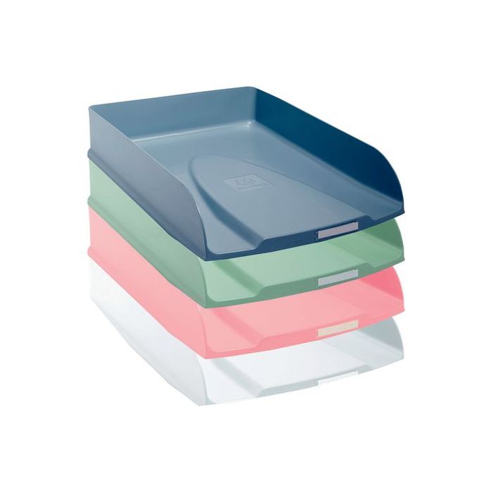 Förpackning 4 LetterTray Styli Autentik Det bästa av design i kombination med det bästa av miljöansvar. En perfekt vit gjord av plastavfall. Autentik-sortimentet erbjuder därför produkter som väcker använd plast till liv igen. En innovation från Exacompta. Med skandinaviska influenser och färger i vitt, godisrosa, salvia och gråblått kommer den här serien att smälta in i både arbetsplatser och hemmakontor. Dessa brevfack, som säljs i set om 4 olika färger, är lämpliga för både arbetsplatsen och hemmakontoret. Deras solidaoch stabila format gör att du kan lagra dokument i A4+-format med en kapacitet på 500 pappersark. De kan staplas vertikalt eller i steg och är modulära efter önskemål, eftersom de är kompatibla med många befintliga modeller. En etiketthållare är placerad till höger för enkel identifiering av dokument. Med respekt för miljön är dessa brevkorgar tillverkade av återvunnen plast från hushållsavfall och är därför Blue Angel-certifierade. 25 års garanti.