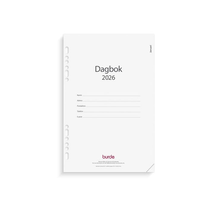 Hålad kalenderrefill till systemkalender med ringmekanism.Kalender 2026 från Burde. Format: 135x205 mm. Layout: Stående. Dag/sida. Timindelning 8-19. Kalendarium: 2026-01-01