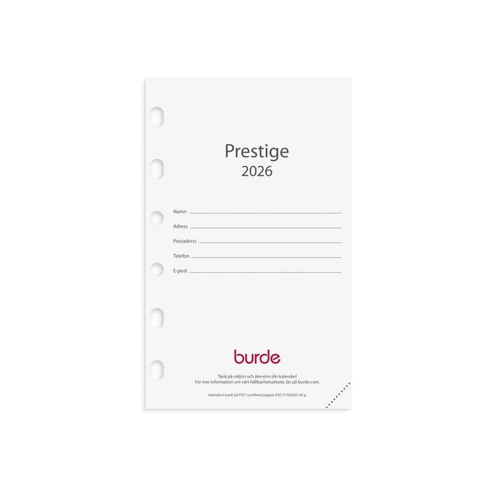 Hålad kalenderrefill till systemkalender med ringmekanism.Kalender 2026 från Burde. Format: 79x127 mm. Layout: Stående. Vecka/uppslag. Timindelning 7-21. Kalendarium: 2025-11-10
