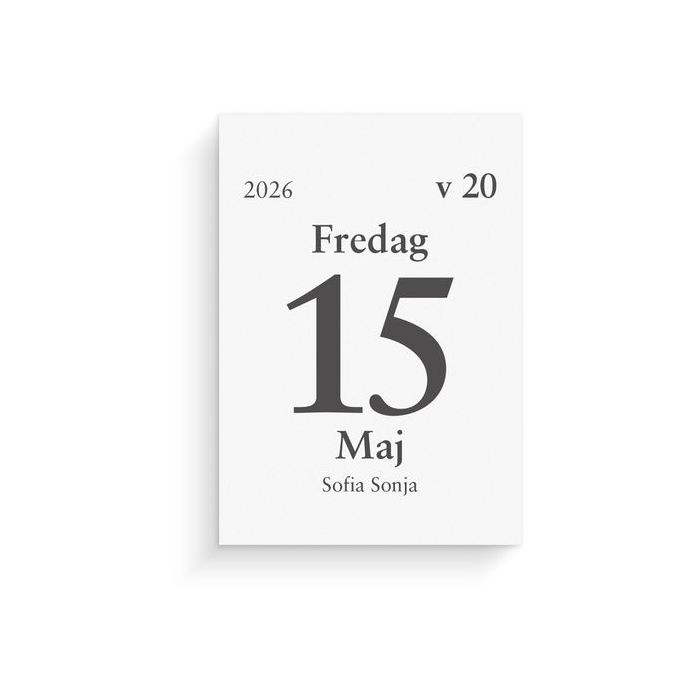Följ året genom att riva av blad efter blad. Dagblocket har en vardag per blad och lördag och söndag på samma blad och det är limbundet med klammerbaksida.Kalender 2026 från Burde. Format: 75x107 mm. Layout: Dag/sida. Kalendarium: 2026-01-01