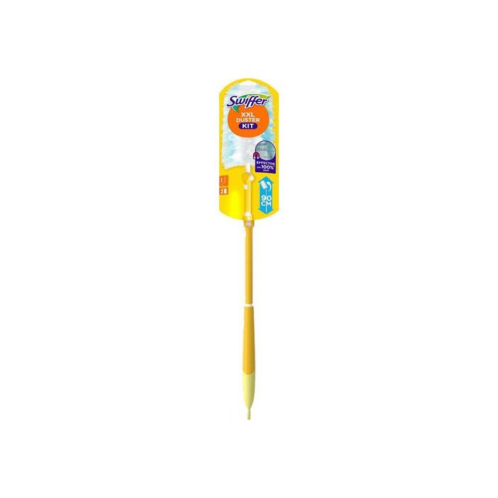 - fångar upp och låser in damm och hår effektivt på alla slags hårda ytor. Swiffer Duster XXL startkit har ett handtag som kan bli 90 cm, vilket gör att du når bättre på exempel vitrinskåp eller andra höjder, utan att behöva ta fram stolen. Handtaget går dessutom att vika ihop och är smidig och använda. Den är effektiv mot damm och allt du behöver göra ett att fluffa upp själva dammvippan och dra över bänken så låser den in damm, smuts och hår. Startkitet innehåller handtaget på 90 cm och 2 stycken refiller. Sedan kan du behålla handtaget och köpa enbart refiller till handtaget. Fångar upp och låser in damm, hår, och allergiframkallande ämnen från dammkvalster, oavsett om du behöver nå höga eller låga ytor. Swiffer fångar även hår från katter och hundar tack vare de tusentals fluffiga fibrerna med en lätt beläggning.