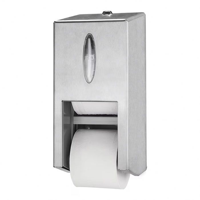 Tilltalande dispenser i rostfritt stål för två toalettrullar utan hylsa som effektivt uppfyller behoven hos upp till 145 gäster.