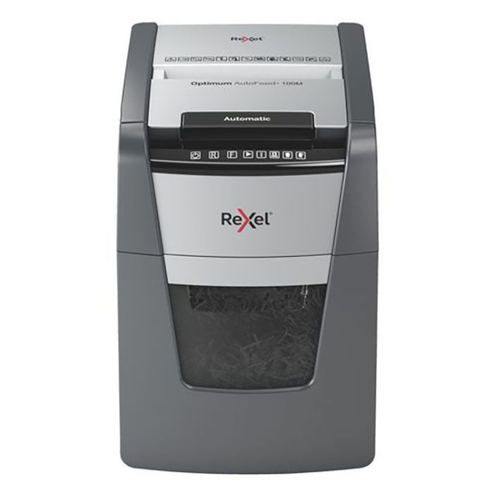Den här automatiska dokumentförstöraren gör allt arbete åt dig. Optimum AutoFeed+ 100M makulerar automatiskt upp till 100 A4 pappersark (80 g/m2) åt gången, i P-5 (2x15 mm) mikro tvärsnitt. Den här dokumentförstöraren med automatisk inmatning är idealisk för användning på kontoret på grund av dess kompakta 34L-avfallsbehållare. Du behöver inte mata papper manuellt eller ta bort häftklamrar och gem först.