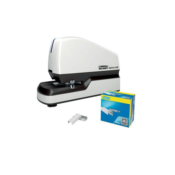 Rapid Optima 60E är en slitstark elektrisk häftapparat som har ett inbyggt förvaringsfack för häftklamrar och en upplyst styrning för klammerplacering. Optima 60E ger kraftfull och problemfri häftning. Häfta enkelt upp till 60 pappersark på en gång (80 g/m²) och spara tid hemma eller på jobbet. Denna kompakta häftapparat är helautomatisk och garanterar hygienisk häftning tack vare beröringsfri och kontaktlös drift. Det justerbara pappersinsättningsdjupet och den tryckta häftklammerguiden ger flexibel men exakt häftklammerplacering. Få aldrig slut på häftklammer med LED-indikatorn för låga häftklammer och få en klammerfri häftning när du använder Optima HD 70-klammer (20