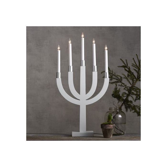 Vit träljusstake med silver målad bas på ljusen. Placera ljusstaken exempelvis i fönstret för att skapa en härlig adventstämning i hemmet. Denna produkt har FSC®-märkning.Färg: VitLjusfärg: KlarMaterial: TräBredd: 35cmHöjd: 67cmDjup: 8cmSockel: E10Anslutningskabelns längd: 180cmLjuskälla ingårIP20/230V