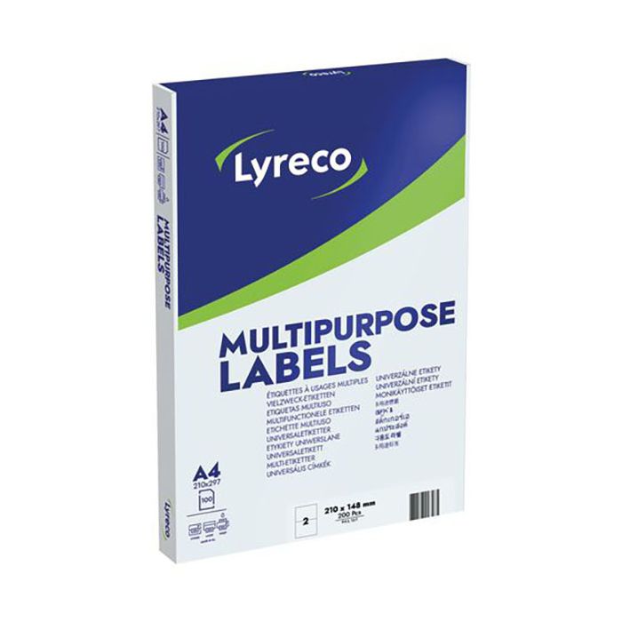 Lyreco Universaletiketter för kopieringsmaskin, inkjet- och laserskrivare. Universaletiketter, Lyreco. 200 universaletiketter 148 x 210 mm. För kopieringsmaskin, inkjet- och laserskrivare. Snabbtorkande etiketter för paket. Fäster pålitligt och permanent. Förpackning med 100 ark (2 etiketter per ark).