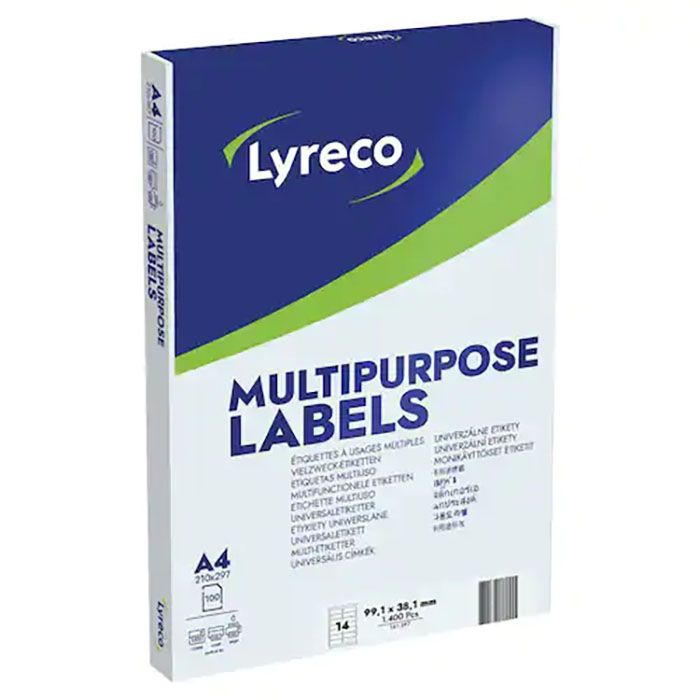 Universaletiketter, Lyreco Premium. Vita etiketter i premiumkvalitet. Universaletiketter, Lyreco. 100 universaletiketter 38,1 x 99,1 mm. För kopieringsmaskin, inkjet- och laserskrivare. Snabbtorkande etiketter för paket. Fäster pålitligt och permanent. Förpackning med 1 400 ark (14 etiketter per ark).