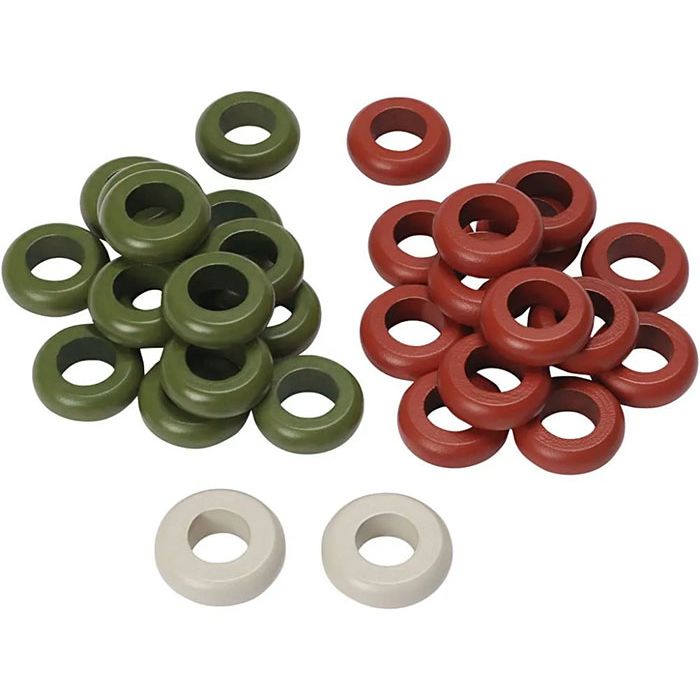 Du kan ersätta förlorade spelpjäser till Micki Couronne med en extra förpackning med de här ringarna i grön, vit och röd. Varje ring är utformad i spelets standardstorlek.