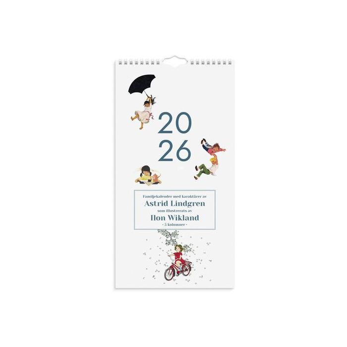 En väggkalender med fem kolumner för att lättare kunna planera och organisera ditt livspussel, du kan själv skapa kalenders funktion utifrån dina behov. Antingen dela in livet i aktiiviteter, matlistor, födelsedagar eller dela in den utifrån familjemedlemmarna i hemmet. Vad om passar bäst i just ert hem. Kalenderns design visar illustrationer gjorda av Ilon Wikland över sagofigurer som har skapats och berättats av Astrid Lindgren.Familjekalender 2026 från Burde. Format: 220x430 mm. Layout: Månad/blad. Kalendarium: 2026-01-01