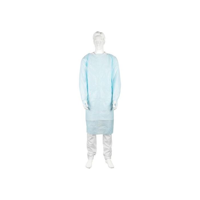 Engångsförkläde av plast med långa ärmar och tumöglor, nackband och knytband i ryggen. Används för att skydda användaren där en hög hygienstandard krävs, t.ex. i sjukvårdssektorn, i livsmedelsindustrin eller i produktions- eller produktförpackningslinjer. Förklädena är förpackade styckvis och i en kartong.