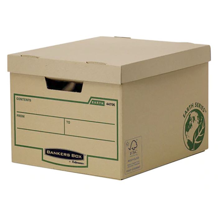 Förvaringskartong, Bankers Box® Earth Series. Kartong för lösa dokument, gaffelpärmar eller arkivlådor.Kartong med handtag som viks inåt. 2-lager kartong i handtagen och botten ger extra styrka. Kan innehålla 4 arkivlådor med 8 cm rygg eller 3 arkivlådor med 10 cm rygg. Utvändiga mått: HxBxL 26 x 32,50 x 37,50 cm.