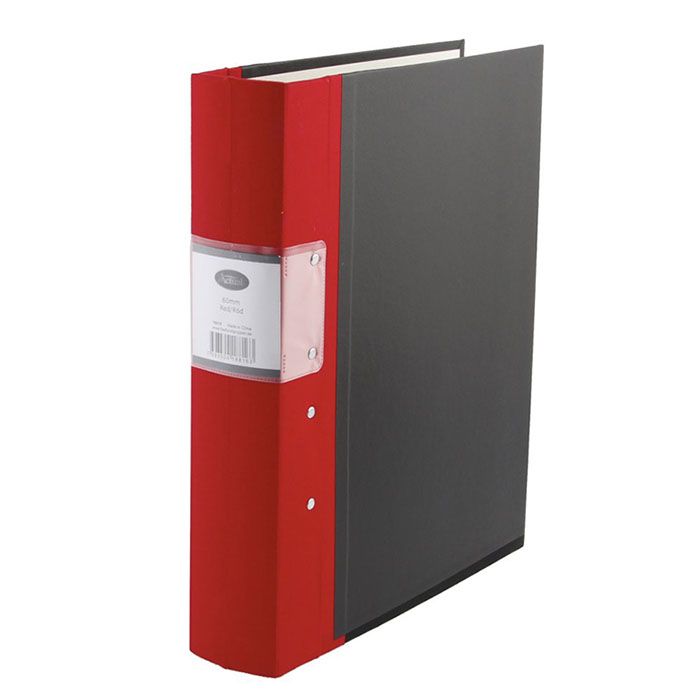 FSC-märkt svart träryggspärm med röd tygklädd rygg. MDF-skiva för en mer stabil och stadig pärm.