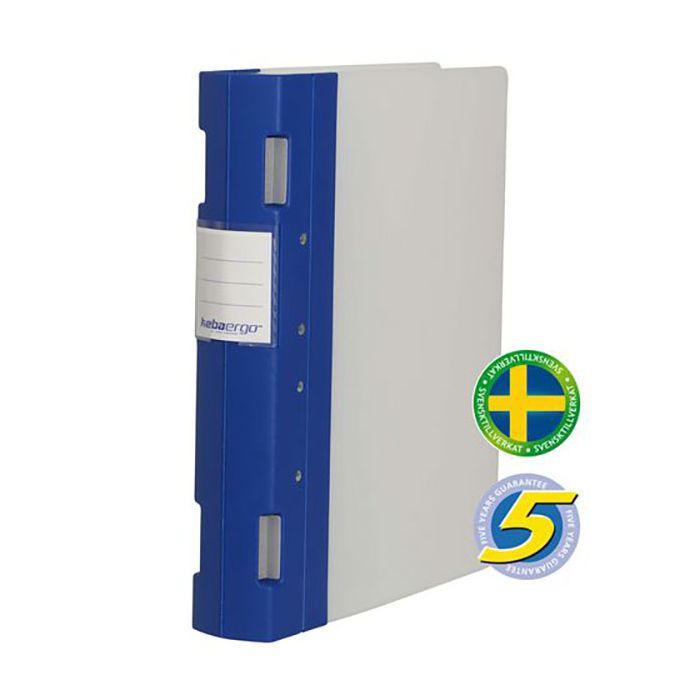 Högkvalitativ, patenterad mekanism, lätt att öppna och stänga. Kraftig pärm för tuffa tag och miljöer. Tillverkad i PP-plast. Tål lång daglig användning. Ergonomiskt utformad rygg som gör det lätt att ta ned den från hyllan. Lätt att torka av med vatten och diskmedel. Etikettmallar finns på www.keba.se. Svensktillverkad, 5 års garanti, 20 st/förp. A4, helrygg 55mm, blå/neutral.
