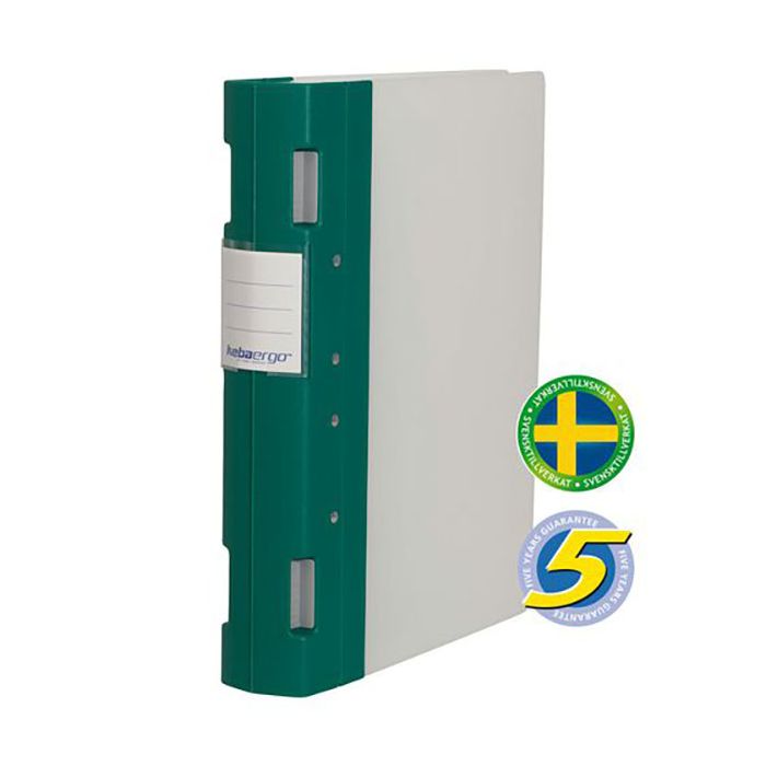 Högkvalitativ, patenterad mekanism, lätt att öppna och stänga. Kraftig pärm för tuffa tag och miljöer. Tillverkad i PP-plast. Tål lång daglig användning. Ergonomiskt utformad rygg som gör det lätt att ta ned den från hyllan. Lätt att torka av med vatten och diskmedel. Etikettmallar finns på www.keba.se. Svensktillverkad, 5 års garanti, 20 st/förp. A4, helrygg 55mm, grön/neutral.