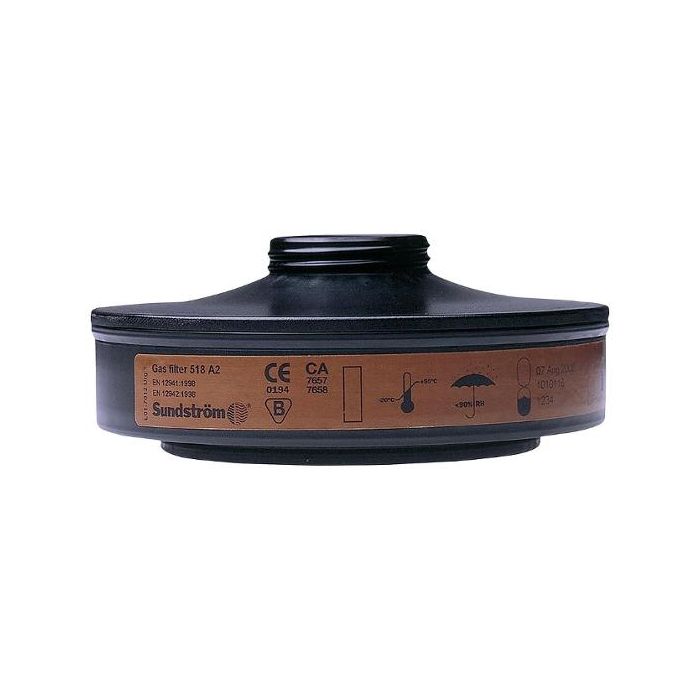 Filter för skydd mot gaser och ångor med optimerad upptagningsförmåga. Gasfilter SUNDSTRÖM SR518 A2 är avsedd för användning i fläkt SR 500/SR 500 EX. Specialdesignade för att klara de höga luftflöden som fläkten ger. Väl dimensionerad kolmängd ger hög upptagningsförmåga och lång livslängd. Fläkten används alltid med 2 identiska filter. Varje filter är testade vid 125 l/min och klarar genombrottstiderna utan minsta läckage. Gasfiltren skall alltid användas i kombination med partikelfilter. A2, skyddar mot organiska gaser och ångor, t ex lösningsmedel, med kokpunkt över +65°C. Produkten är CE-märkt. Godkänd enligt: EN 12941:1998 + A2:2008, EN 12942:1998 + A2:2008 Material: aktivt kol, PC/ABS, polyester Färg: svart CE-märkt