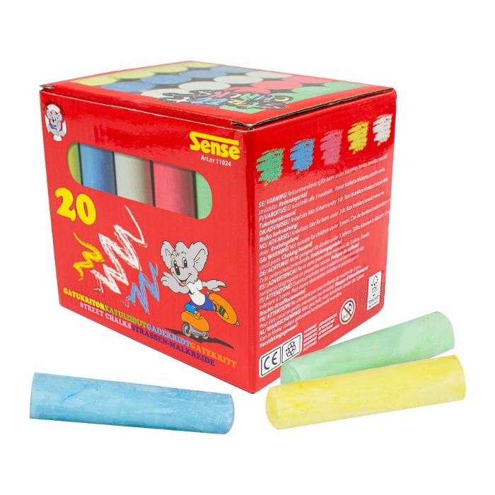 Lekfull sommaraktivitet som inspirerar till fantasi, rörelse och kreativitet. Pigga upp skolgården, gårdsplanen eller trottoaren med dessa färgstarka gatukritor. Kritorna levereras i en praktisk pappask med bärhandtag, behandlad med en glansig yta som ger ett visst skydd mot väta – perfekt för både förvaring och transport. Låt barnen rita hopphagar, mönster, figurer och egna fantasivärldar direkt på asfalten. Och bäst av allt: alla kritmärken försvinner enkelt med vatten, så kreativiteten kan flöda fritt om och om igen. Antal: 20/fp Material: Gips, pigment Papperskartong av FSC certifierat papper CE