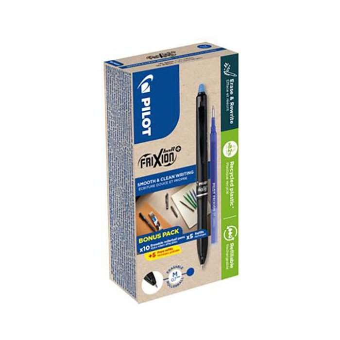 Nu introducerar de den första raderbara pennan gjord av >82 % återvunnen plast*. Frixion Ball+ är påfyllningsbar och att byta en tom patron mot en ny är enkelt, och definitivt billigare än att köpa en ny penna. Frixion Ball+ har en tredjeparts TYPE-1 certifiering enligt Ecomark enligt ISO-14024. Sofistikerad, elegant i mattsvart pennkropp med ett nytt ergonomiskt triangulärt grepp. (*exklusive förpackning, refill eller ingående komponenter ej tillverkade av plast).