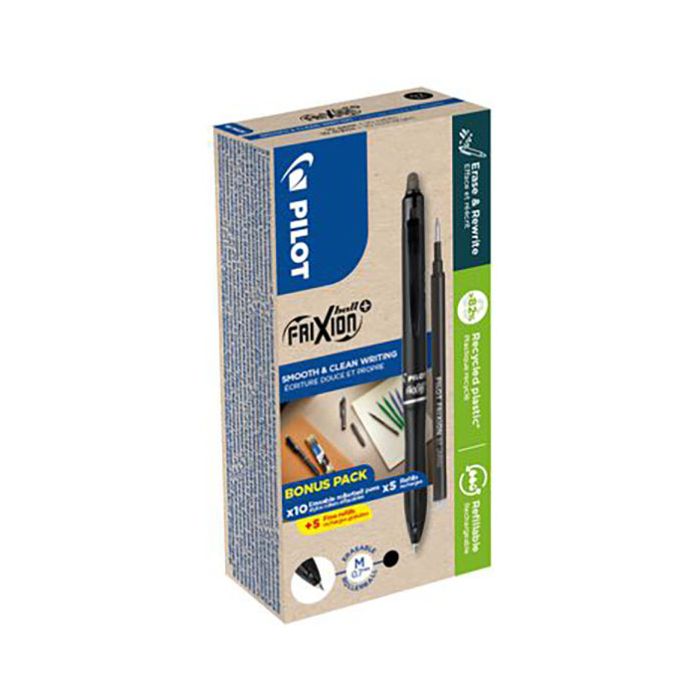 Nu introducerar de den första raderbara pennan gjord av >82 % återvunnen plast*. Frixion Ball+ är påfyllningsbar och att byta en tom patron mot en ny är enkelt, och definitivt billigare än att köpa en ny penna. Frixion Ball+ har en tredjeparts TYPE-1 certifiering enligt Ecomark enligt ISO-14024. Sofistikerad, elegant i mattsvart pennkropp med ett nytt ergonomiskt triangulärt grepp. (*exklusive förpackning, refill eller ingående komponenter ej tillverkade av plast).