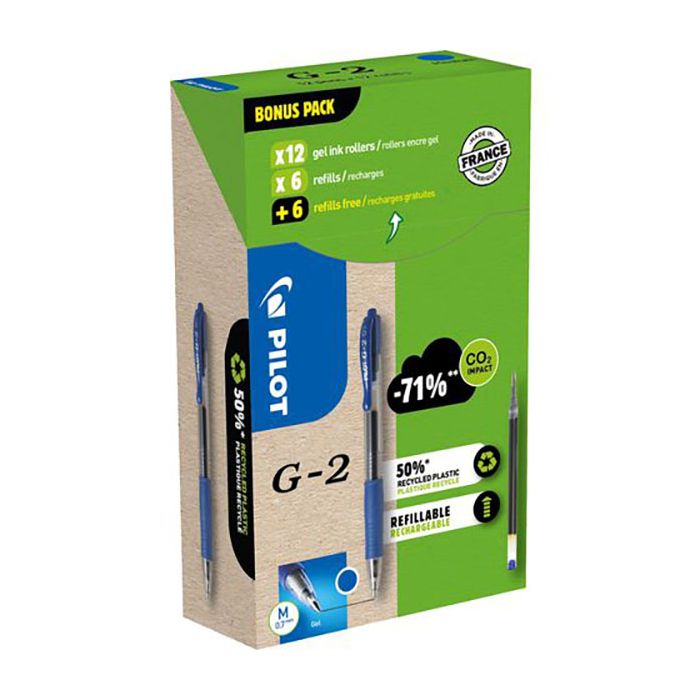Detta Greenpack innehåller våra blå G-2 medium pennor och tillhörande refills. Njut av den otroligt mjuka och sköna skrivkänslan tack vare den ergonomiska designen och gummigreppet. Vattenresistent och kladdfri gör G-2 till en pålitlig penna. Pennorna i den här förpackningen är gjorda av minst 50% återvunnen plast (exkl. refills och produktförpackning) och är 100% påfyllnadsbara för att spara på planetens resurser. Tillsammans kan vi minska vårt avfall genom att anta ett bättre konsumtionsbeteende. Det här är ett riktigt ekonomiskt och miljömedvetet alternativ att ha på jobbet, utan att tumma på kvalitén. PILOT fortsätter att utveckla lösningar som har en positiv påverkan på vår miljö och som hjälper ditt företag att minska koldioxidavtrycket. Små detaljer kan göra stor skillnad: Genom att fylla på din penna med tre refills (jämfört med fyra pennor) kan du minska koldioxidavtrycket med 61%. Att använda refills hjälper dig även att minska användarkostnaden och gör att du sparar pengar!