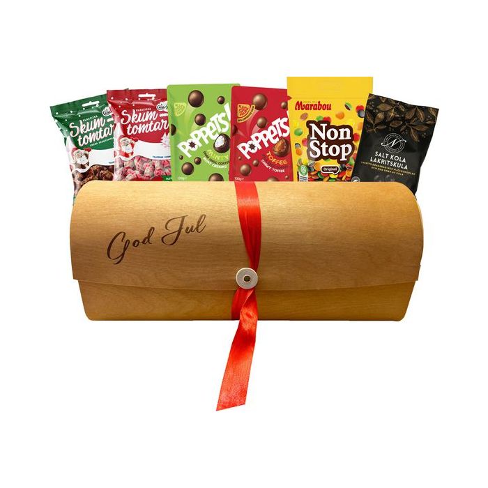 Trälåda fylld med Skumtomtar, Poppets Minty och Toffee, Nonstop och Salt Kola Lakritskulor.