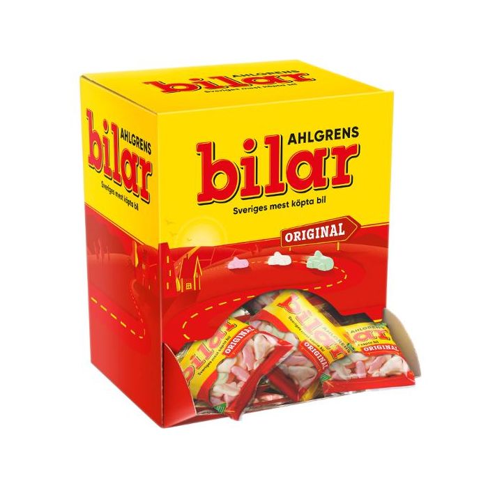 - Sveriges mest köpta bil. Den klassiska bilmodellen har funnits sedan 1953 och är en välkänd modell i alla svenska hem. Det har tillkommit flera nya modeller, men originalet förblir orörd. Bilarna kommer i färgerna rosa, vit och grön, men om smaken är densamma är osagt, testa själv! Den praktiska displaykartongen med 100 portionspåsar à 30 gram är perfekt för kassalinjen, caféet, butiken eller kontorets godishörna. 100 påsar a 30 gram Displaykartong