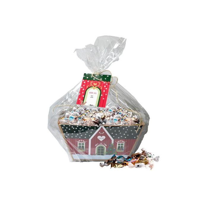 Pralin- och kolamix i en fin gåvokorg med cellofan. En smakfull kombination av delikata praliner och krämiga kolor, noggrant samlad i en elegant korg och inslagen i cellofan. Perfekt som gåva till nära, kära eller kollegor – en garanterad succé som sprider både smakglädje och julstämning. Innehåller bland annat Werthers kola, Nöt-Creme Chocokulor, Ryfors Lakritskola, Ryfors Gräddkola, Ryfors Chokladkola med mera. Godiset kommer i en pappersask med cellofan samt en God Jul hälsning. 5 kg Ca. 700 st