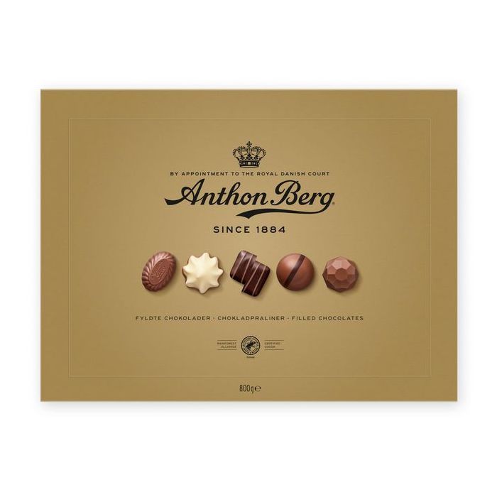 Anthon Bergs Guldask lanserades 1937 och varförmodligen Danmarks första presentask med choklad ochden är idag danskarnas favorit.Den innehåller ett brett urvalav klassiska fyllda praliner med marsipan, nougat, krämigkaramell, kokos m.fl. Asken med den ikoniska guldfärgen ären perfekt gåva till värdinnan, jubilaren eller en god vän