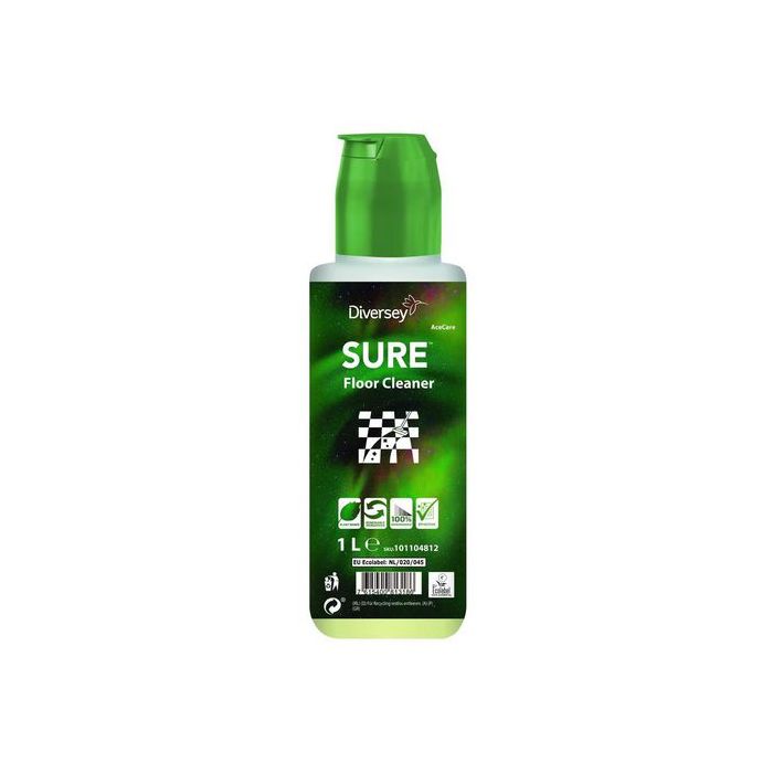 Miljömärkt lågskummande golvrengöringsmedel utan färg och parfym. SURE Floor Cleaner är ett koncentrerat lågskummande golvrengöringsmedel för alla vattentåliga hårda golv. Rekommenderad för alla städmetoder inklusive hink och kombiskurmaskin applikationer. Produkten är miljömärkt med EU-Ecolabel. Säker daglig användning på alla vattentåliga golv, inga gråa golv eller ”fet hinna” på golvet. SURE är en del av ett unikt sortiment av växtbaserade, 100% biologiskt nedbrytbara, professionella rengöringsprodukter för alla dina dagliga rengöringsbehov.