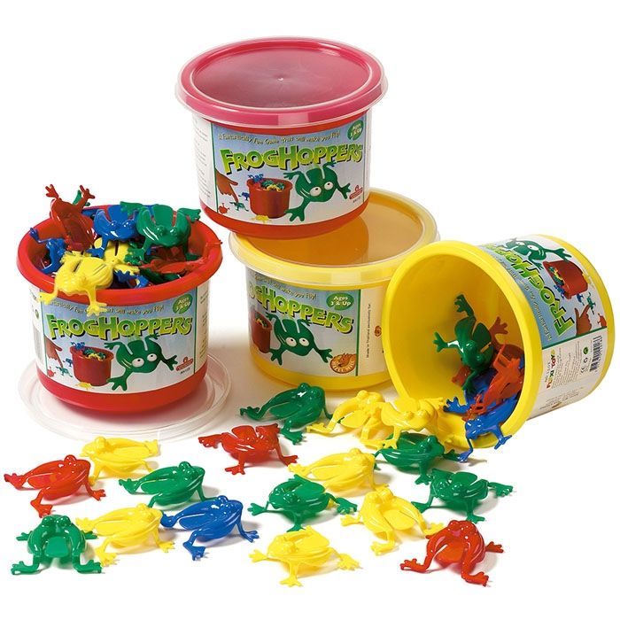 Hjälper till att utveckla barns finmotorik och lär dem att räkna. Ett slags loppspel. Man knäpper på grodorna så att de landar i burken. I spelet ingår 16 grodor av ABS plast och kraftig burk av polyetenplast.