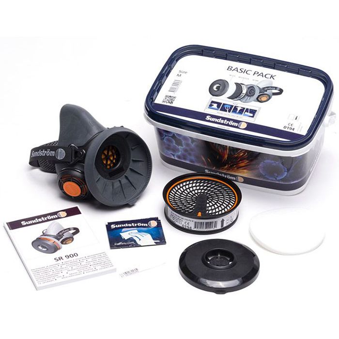 Förpackad i förvaringsbox för dammfri förvaring. Boxen innehåller halvmask SR 900 M, partikelfilter SR 510 P3 R, 5 st förfilter SR 221, förfilterhållare, rengöringsservett och bruksanvisning.