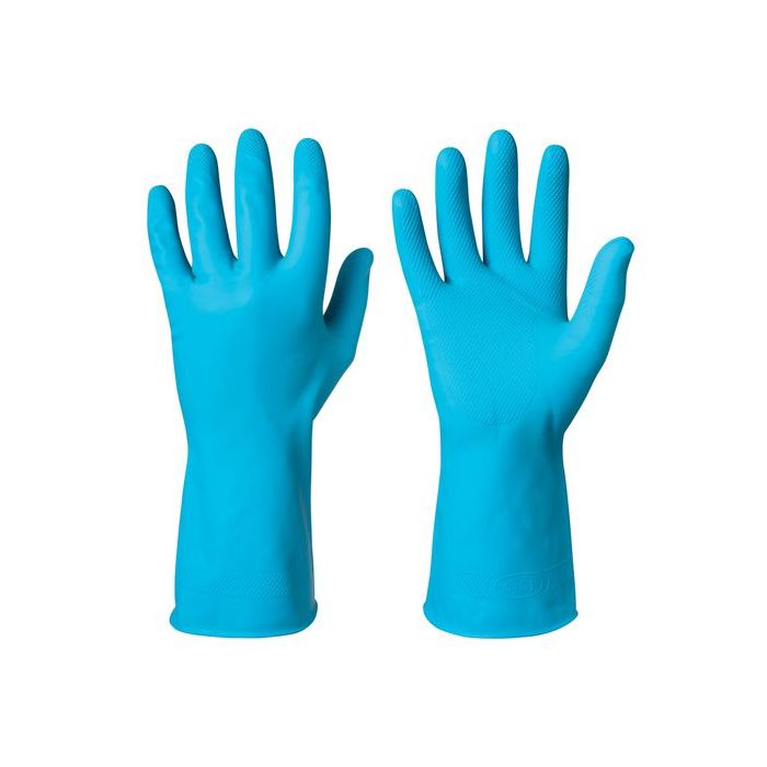 Kemikalieresistenta handskar i latexMjukt, följsamt material som inte tröttar ut handen. Slitstark rullkant på handskarna som gördem lätta att ta på och av. Mönster i innerhand ger bra grepp både i våta och torra miljöer, samt vid hantering av feta livsmedel. Flossat bomullsfoder som absorberar fukt. Godkända för användning i direkt kontakt med alla typer av livsmedel, inklusive livsmedel med hög fetthalt (EN 1186).CE Cat.IIIGodkänd enligt: EN ISO 21420 + EN 388: 2016+A1:2018 + EN 374-1:2016+A1:2018/Typ A + EN 374-5:2016 + EN 1186 + EN 421Material: Latex, bomullsfoderTjocklek: 0,38 mmLängd: 30 cmFärg: BlåStorlek: XS | S | M | L | XL