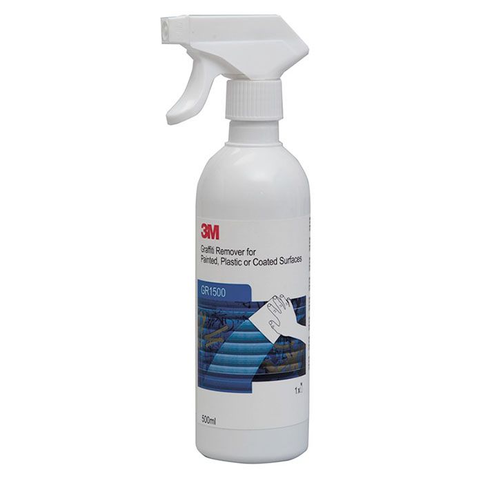 Graffitiborttagningssprayen 3M℃ GR1500 har en hög kokpunkt och rengör t.ex. graffiti, sprayfärg, kritfläckar, läppstiftsfläckar, fläckar från märkpennor och emulsionsfärg. Rengöringsmedlen avlägsnar enkelt märken från behandlade ytor och ytor av plast utan att orsaka skador eller lämna fläckar efter sig. Dessa borttagningsmedel har en svag lukt och innehåller inga aromatiska, alifatiska eller klorbaserade lösningsmedel, vilket gör dem bekväma att använda.