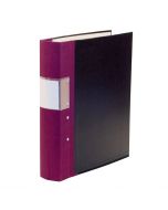 Gaffelpärm med svarta pärmsidor med kantförstärkning och raka hörn. Tygklädd trärygg och etiketthållare.