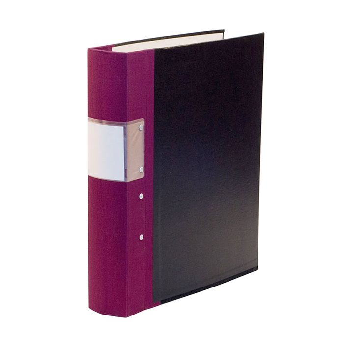 Gaffelpärm med svarta pärmsidor med kantförstärkning och raka hörn. Tygklädd trärygg och etiketthållare.