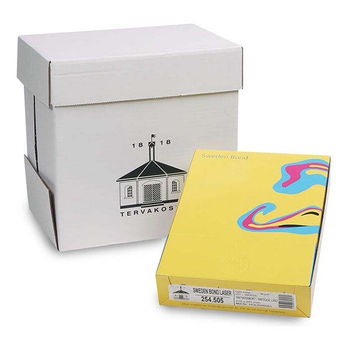 Antikrandat, ohålat, matt. 50% lump. Oplacerat vattenmärke. Lämpligt för kopiering, laser och offsettryck. ECF (Elementärt klorfri). 500/bunt. A4, 90g, ohålat.