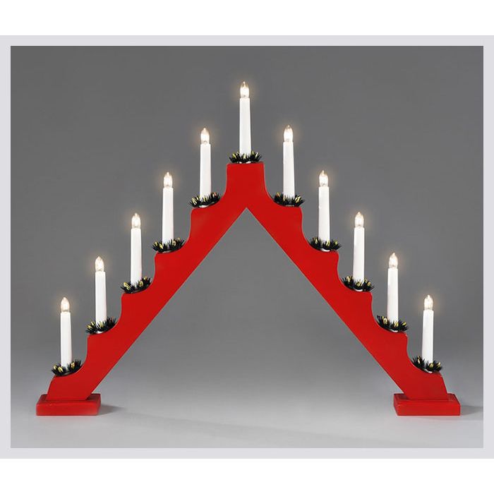 En 11-armad elljusstake i rödlackat trä som skapar mysig stämning i juletid. Den har varmvita lampor och en vit anslutningssladd på 1,7 meter med strömbrytare. Höjd 51 cm och bredd 65,5 cm.