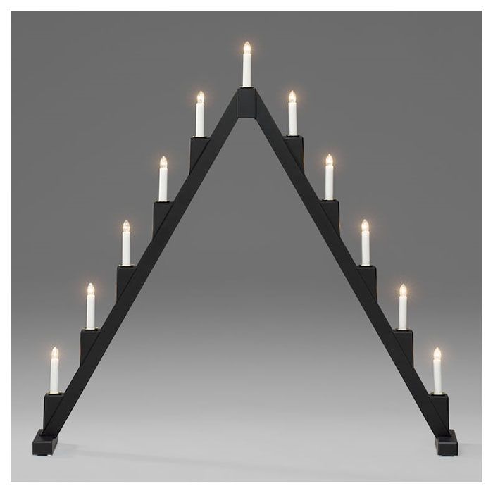 Vikbar 11-armad ljusstake i trä med varmvita LED lampor. Svartlackad med mässingsfärgade dekorationsringar. Anslutningssladd på 1,7 meter. Strömbrytare för manuell avstängning/påslagning. Höjd 82 cm och bredd 86 cm.